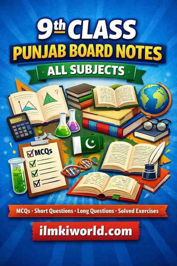 9th Class Punjab Board Notes for All Subjects (2026) – a study resource (usually in PDF format) that you can download and use for preparing for exams. These notes are designed as per the latest Punjab Board syllabus and exam pattern and include MCQs, short and long questions, solved examples, definitions, and more for all subjects.